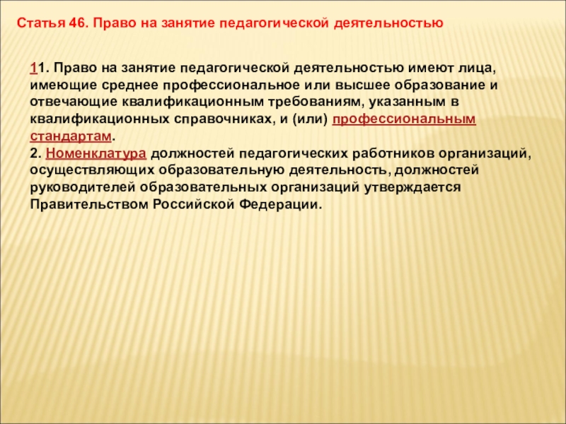 Слайд 15Статья 46. Право на занятие педагогической деятельностью