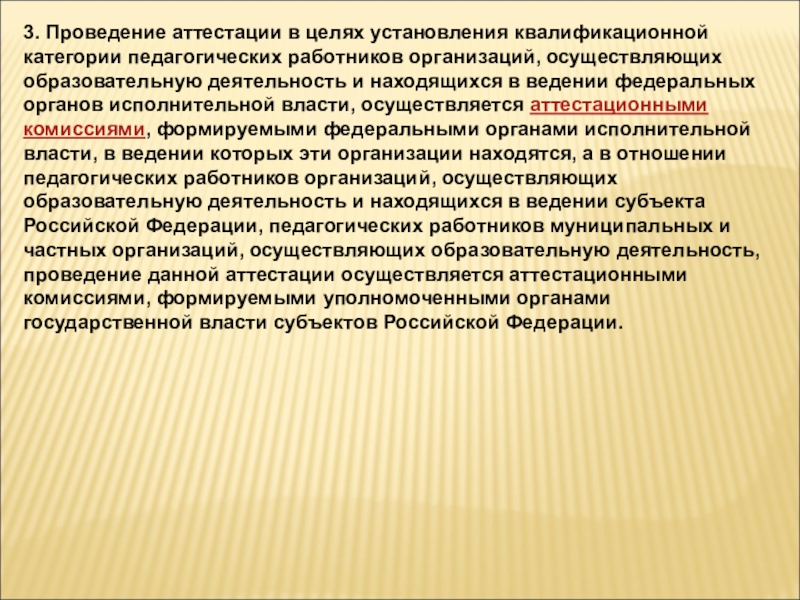 осуществляющих образовательную деятельность и находящихся в ведении федеральных органов исполнительной власти, осуществляется аттестационными комиссиями, формируемыми федеральными органами исполнительной власти, в ведении которых эти организации находятся, а в отношении педагогических работников организаций, осуществляющих образовательную деятельность и находящихся в ведении субъекта Российской Федерации, педагогических работников муниципальных и частных организаций, осуществляющих образовательную деятельность, проведение данной аттестации осуществляется аттестационными комиссиями, формируемыми уполномоченными органами государственной власти субъектов Российской Федерации.