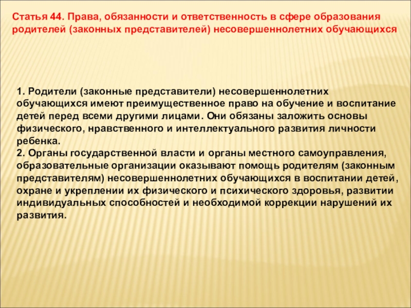 Слайд 14Статья 44. Права, обязанности и ответственность в сфере образования родителей (законных представителей)