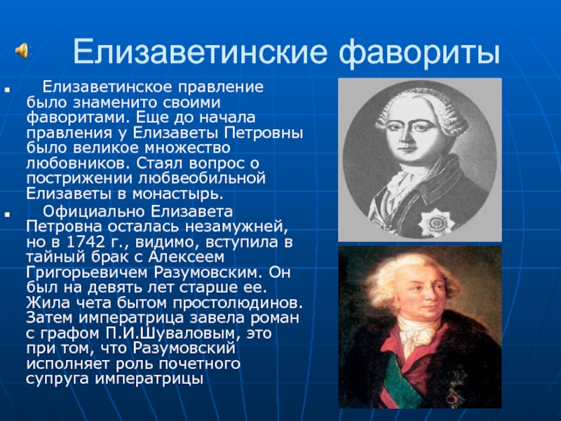 Елизаветинские фавориты  Елизаветинское правление было знаменито своими фаворитами. Еще до начала правления у Елизаветы Петровны было
