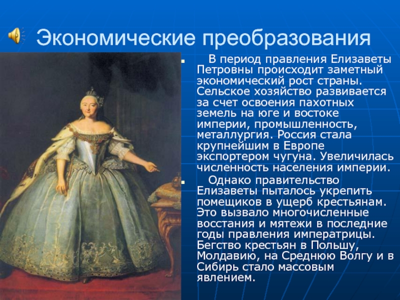 Экономические преобразования  В период правления Елизаветы Петровны происходит заметный экономический рост страны. Сельское хозяйство развивается за
