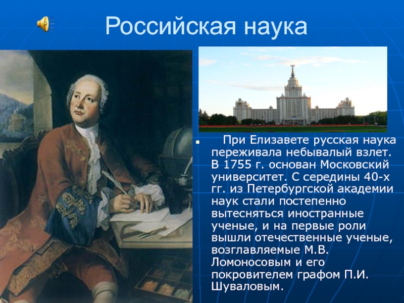 Российская наука  При Елизавете русская наука переживала небывалый взлет. В 1755 г. основан Московский университет. С