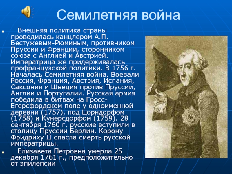 Семилетняя война  Внешняя политика страны проводилась канцлером А.П.Бестужевым-Рюминым, противником Пруссии и Франции, сторонником союза с Англией