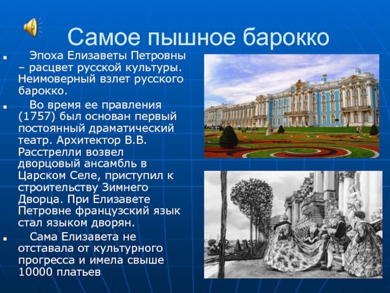 Самое пышное барокко  Эпоха Елизаветы Петровны – расцвет русской культуры. Неимоверный взлет русского барокко.  Во
