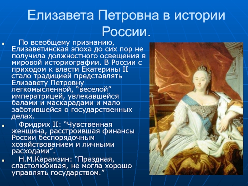 до сих пор не получила должностного освещения в мировой историографии. В России с приходом к власти Екатерины II стало традицией представлять Елизавету Петровну легкомысленной, “веселой” императрицей, увлекавшейся балами и маскарадами и мало заботившейся о государственных делах.