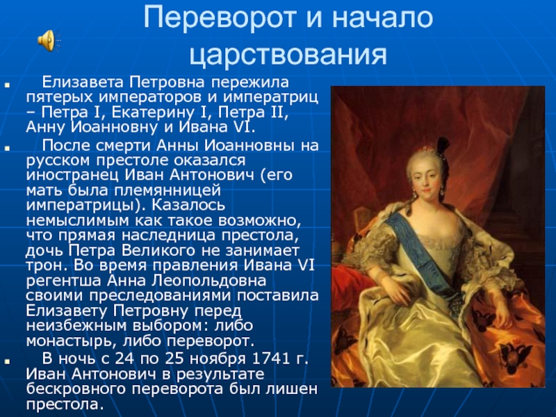 Переворот и начало царствования  Елизавета Петровна пережила пятерых императоров и императриц – Петра I, Екатерину I,
