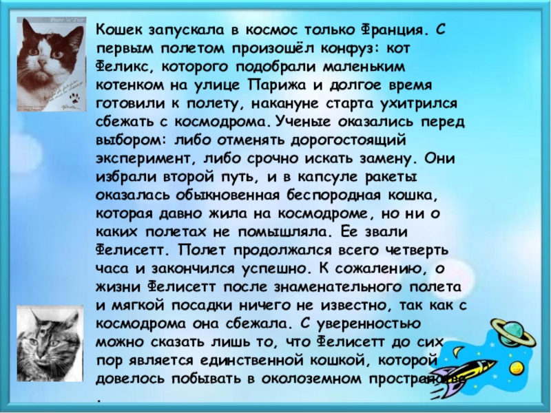кот Феликс, которого подобрали маленьким котенком на улице Парижа и долгое время готовили к полету, накануне старта ухитрился сбежать с космодрома. Ученые оказались перед выбором: либо отменять дорогостоящий эксперимент, либо срочно искать замену. Они избрали второй путь, и в капсуле ракеты оказалась обыкновенная беспородная кошка, которая давно жила на космодроме, но ни о каких полетах не помышляла. Ее звали Фелисетт. Полет продолжался всего четверть часа и закончился успешно. К сожалению, о жизни Фелисетт после знаменательного полета и мягкой посадки ничего не известно, так как с космодрома она сбежала. С уверенностью можно сказать лишь то, что Фелисетт до сих пор является единственной кошкой, которой довелось побывать в околоземном пространстве .