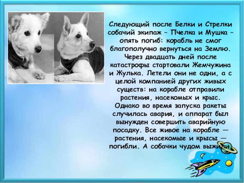 – опять погиб: корабль не смог благополучно вернуться на Землю. Через двадцать дней после катастрофы стартовали Жемчужина и Жулька. Летели они не одни, а с целой компанией других живых существ: на корабле отправили растения, насекомых и крыс. Однако во время запуска ракеты случилась авария, и аппарат был вынужден совершить аварийную посадку. Все живое на корабле — растения, насекомые и крысы — погибли. А собачки чудом выжили.