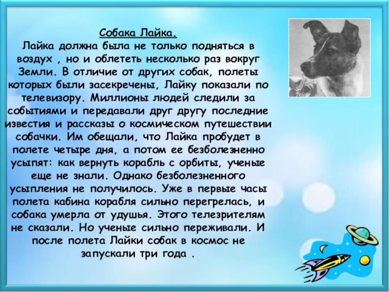 и облететь несколько раз вокруг Земли. В отличие от других собак, полеты которых были засекречены, Лайку показали по телевизору. Миллионы людей следили за событиями и передавали друг другу последние известия и рассказы о космическом путешествии собачки. Им обещали, что Лайка пробудет в полете четыре дня, а потом ее безболезненно усыпят: как вернуть корабль с орбиты, ученые еще не знали. Однако безболезненного усыпления не получилось. Уже в первые часы полета кабина корабля сильно перегрелась, и собака умерла от удушья. Этого телезрителям не сказали. Но ученые сильно переживали. И после полета Лайки собак в космос не запускали три года .