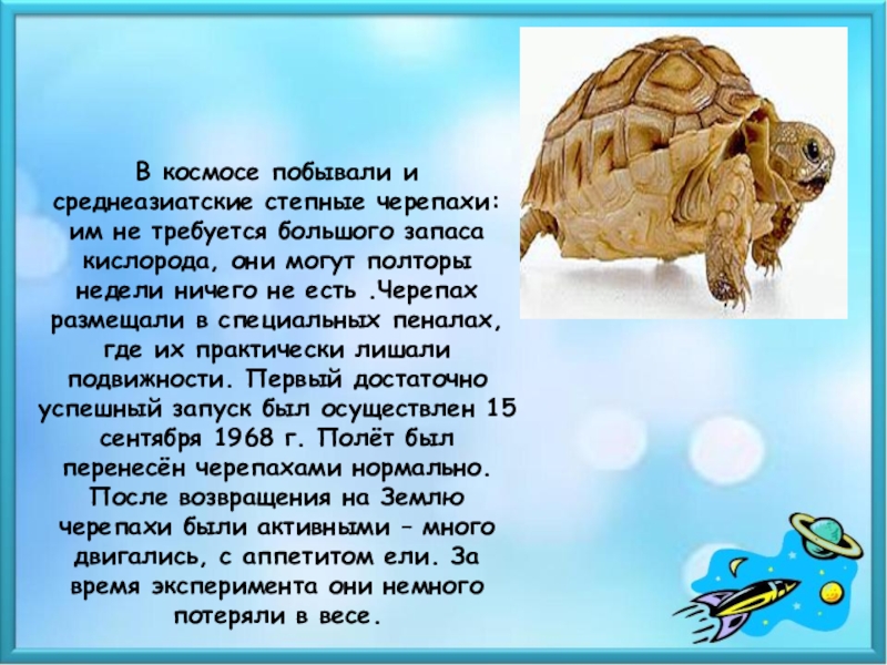 Слайд 12В космосе побывали и среднеазиатские степные черепахи: им не требуется большого