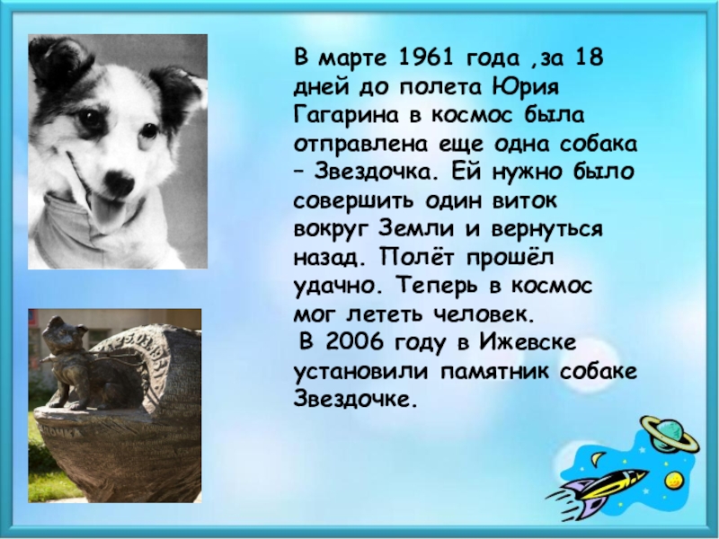 в космос была отправлена еще одна собака – Звездочка. Ей нужно было совершить один виток вокруг Земли и вернуться назад. Полёт прошёл удачно. Теперь в космос мог лететь человек.