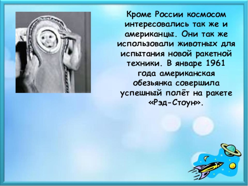 использовали животных для испытания новой ракетной техники. В январе 1961 года американская обезьянка совершила успешный полёт на ракете «Рэд-Стоун».
