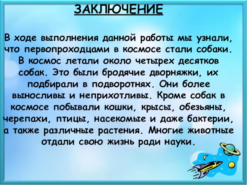 стали собаки. В космос летали около четырех десятков собак. Это были бродячие дворняжки, их подбирали в подворотнях. Они более выносливы и неприхотливы. Кроме собак в космосе побывали кошки, крысы, обезьяны, черепахи, птицы, насекомые и даже бактерии, а также различные растения. Многие животные отдали свою жизнь ради науки.