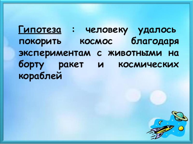 Слайд 3Гипотеза : человеку удалось покорить космос благодаря экспериментам с животными на