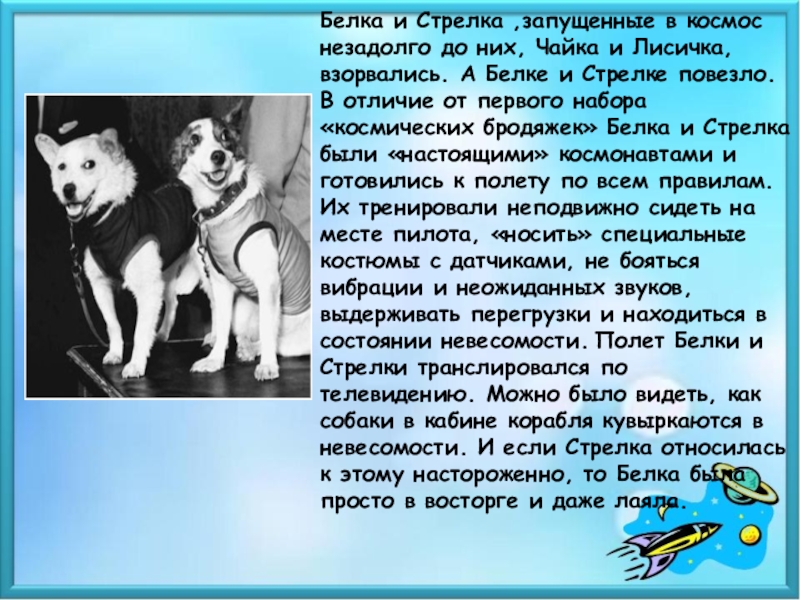 Лисичка, взорвались. А Белке и Стрелке повезло. В отличие от первого набора «космических бродяжек» Белка и Стрелка были «настоящими» космонавтами и готовились к полету по всем правилам. Их тренировали неподвижно сидеть на месте пилота, «носить» специальные костюмы с датчиками, не бояться вибрации и неожиданных звуков, выдерживать перегрузки и находиться в состоянии невесомости. Полет Белки и Стрелки транслировался по телевидению. Можно было видеть, как собаки в кабине корабля кувыркаются в невесомости. И если Стрелка относилась к этому настороженно, то Белка была просто в восторге и даже лаяла.
