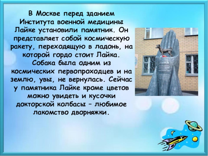 Слайд 6В Москве перед зданием Института военной медицины Лайке установили памятник. Он