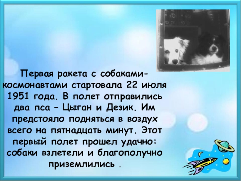 отправились два пса – Цыган и Дезик. Им предстояло подняться в воздух всего на пятнадцать минут. Этот первый полет прошел удачно: собаки взлетели и благополучно приземлились .
