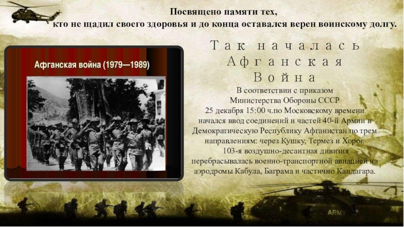 25 декабря 15:00 ч.по Московскому времени начался ввод соединений и частей 40-й Армии в Демократическую Республику Афганистан по трем направлениям: через Кушку, Термез и Хорог.