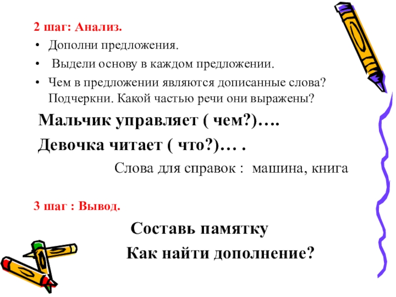 2 шаг: Анализ.Дополни предложения. Выдели основу в каждом предложении.   Чем в предложении являются дописанные слова?