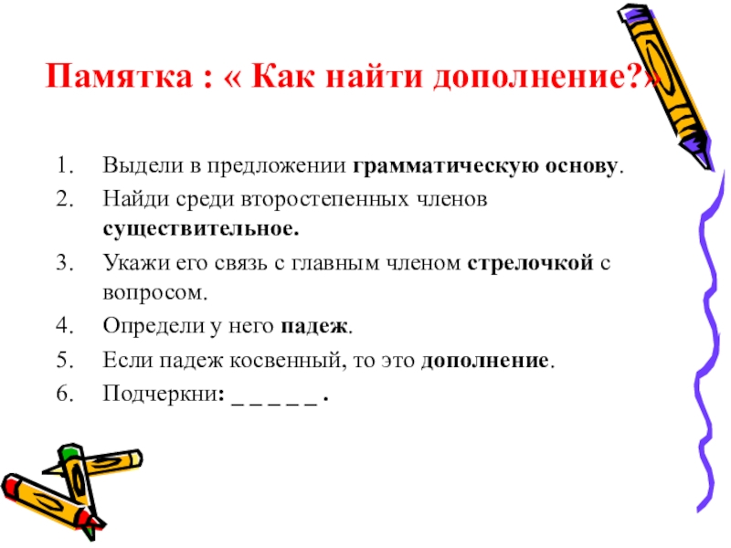 Памятка : « Как найти дополнение?» Выдели в предложении грамматическую основу.Найди среди второстепенных членов существительное.Укажи его связь