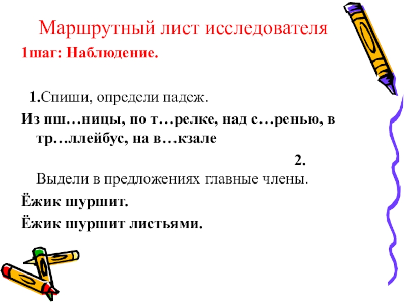 Маршрутный лист исследователя1шаг: Наблюдение. 1.Спиши, определи падеж.Из пш…ницы, по т…релке, над с…ренью, в тр…ллейбус, на в…кзале