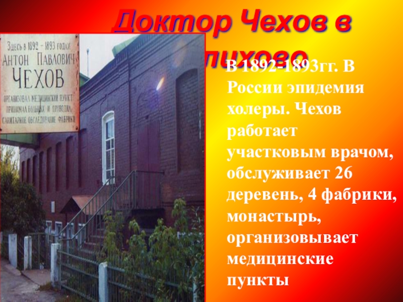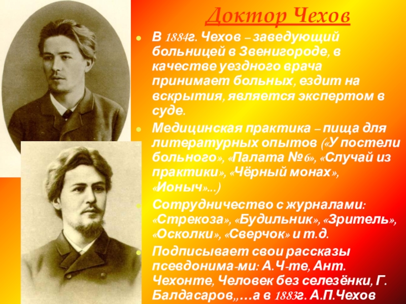 В 1884г. Чехов – заведующий больницей в Звенигороде, в качестве уездного врача принимает больных, ездит на вскрытия, является экспертом в суде.