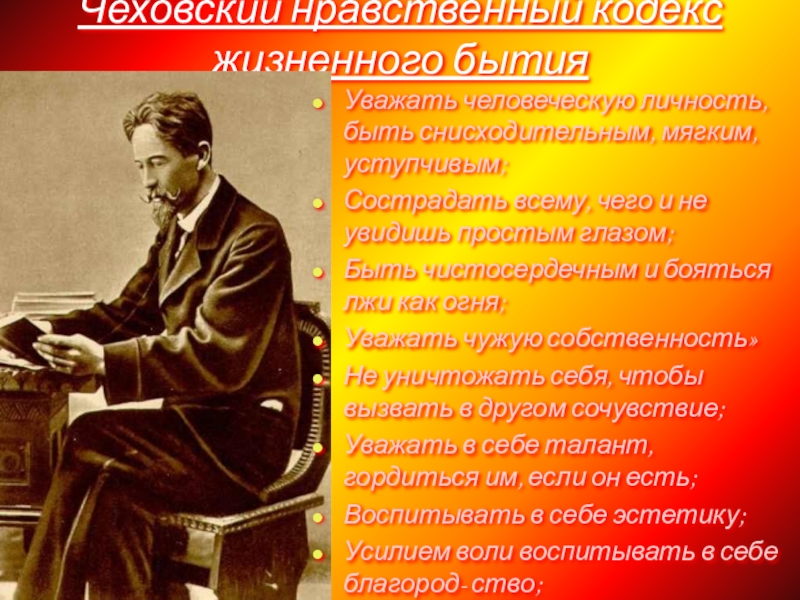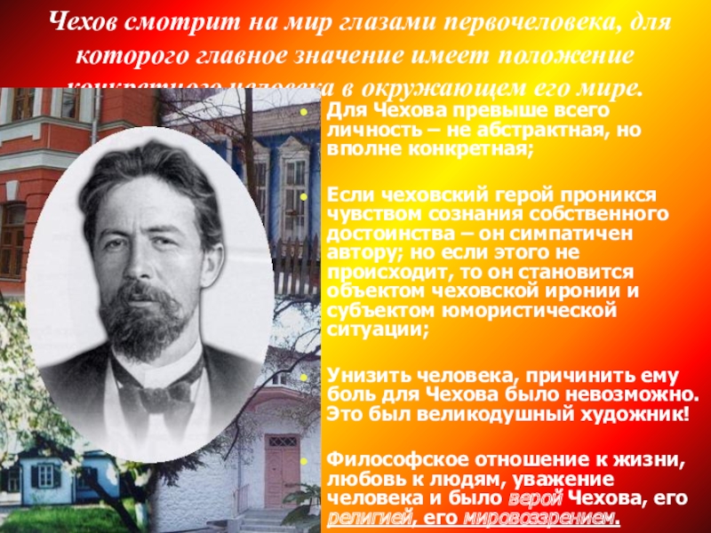 Философское отношение к жизни, любовь к людям, уважение человека и было верой Чехова, его религией, его мировоззрением.