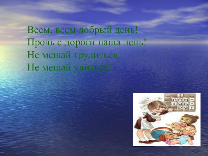 Всем, всем добрый день!  Прочь с дороги наша лень!  Не мешай трудиться, Не мешай учиться!