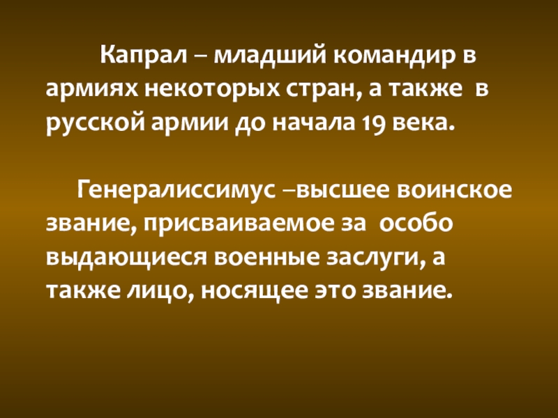 Капрал – младший командир в армиях некоторых стран, а также в русской армии до начала 19 века.