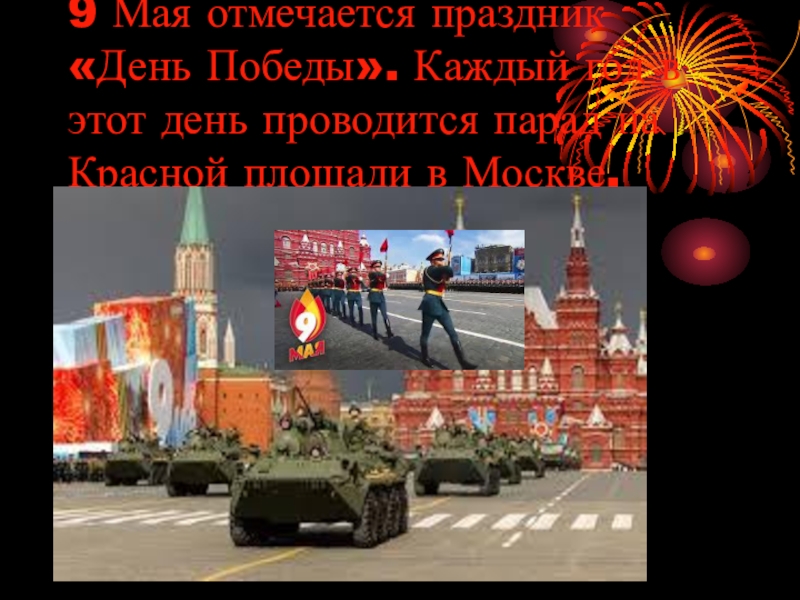9 Мая отмечается праздник «День Победы». Каждый год в этот день проводится парад на Красной площади в