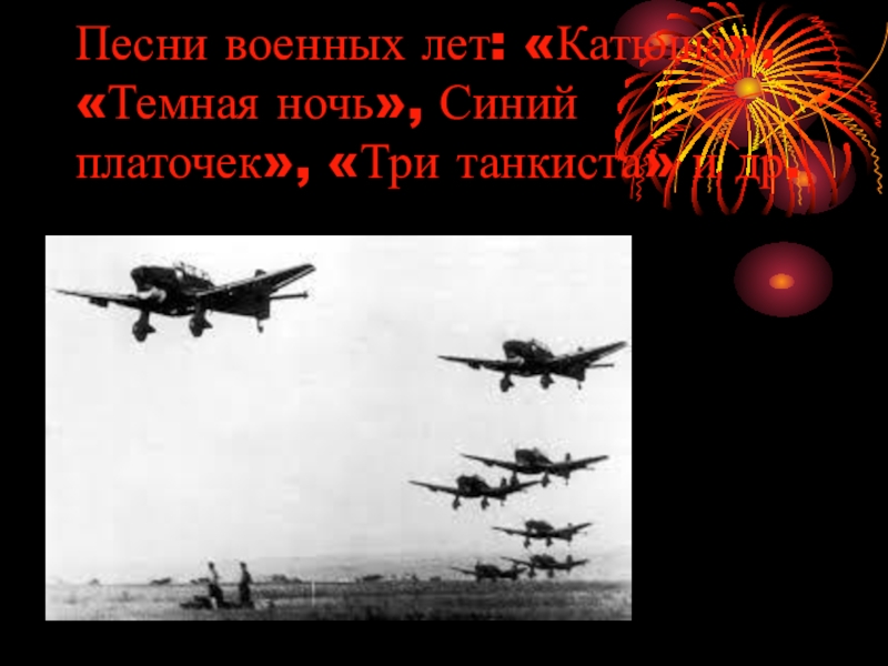 Слайд 10Песни военных лет: «Катюша», «Темная ночь», Синий платочек», «Три танкиста» и