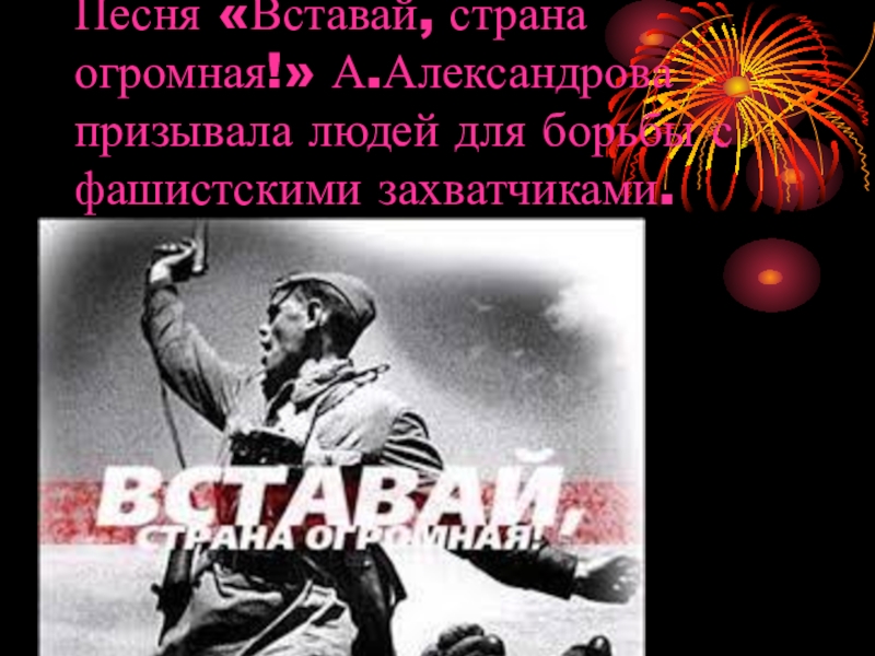 Слайд 7Песня «Вставай, страна огромная!» А.Александрова призывала людей для борьбы с фашистскими