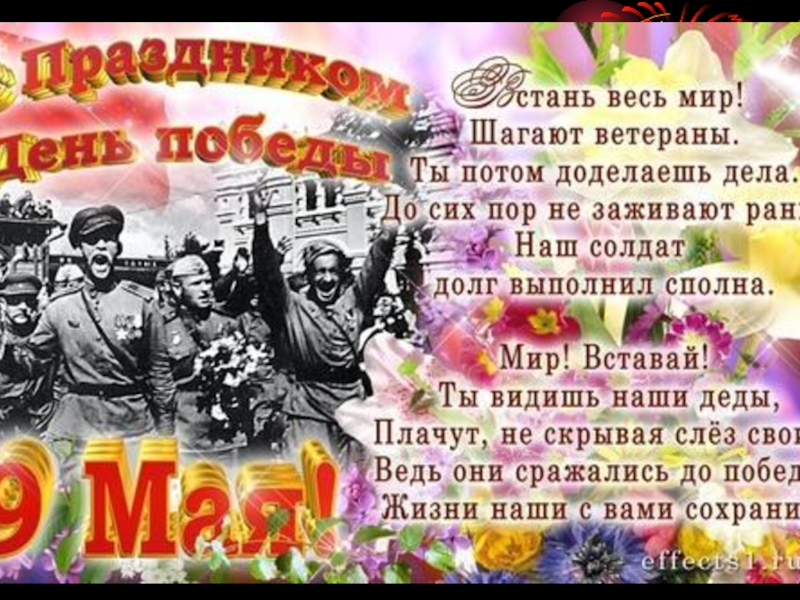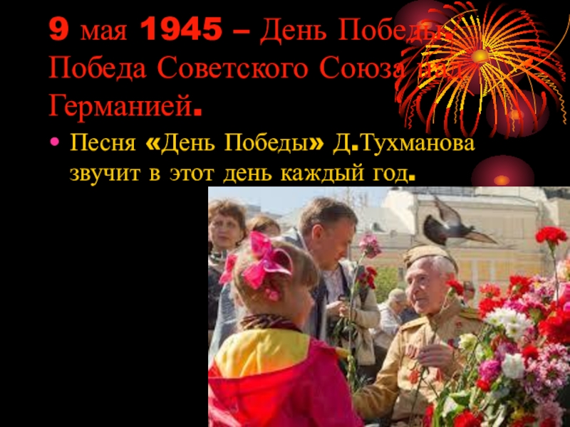 9 мая 1945 – День Победы. Победа Советского Союза над Германией.Песня «День Победы» Д.Тухманова звучит в этот