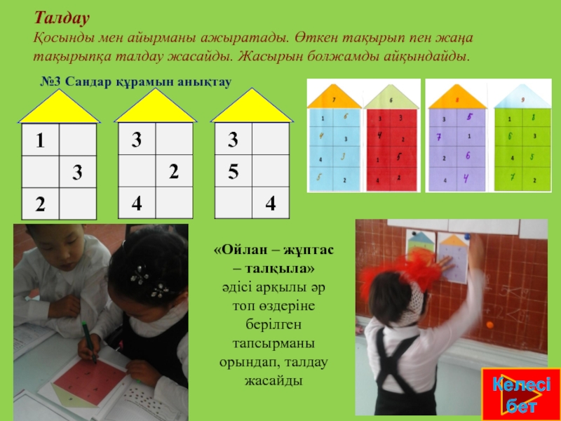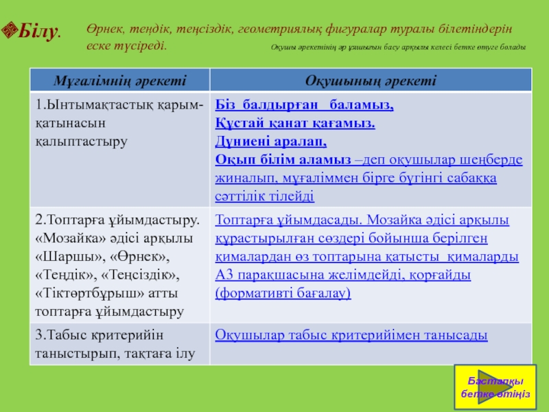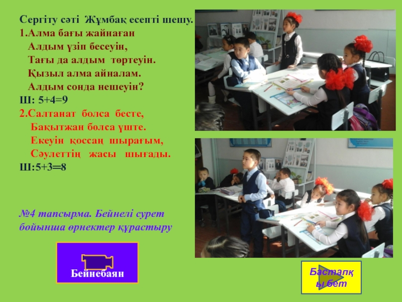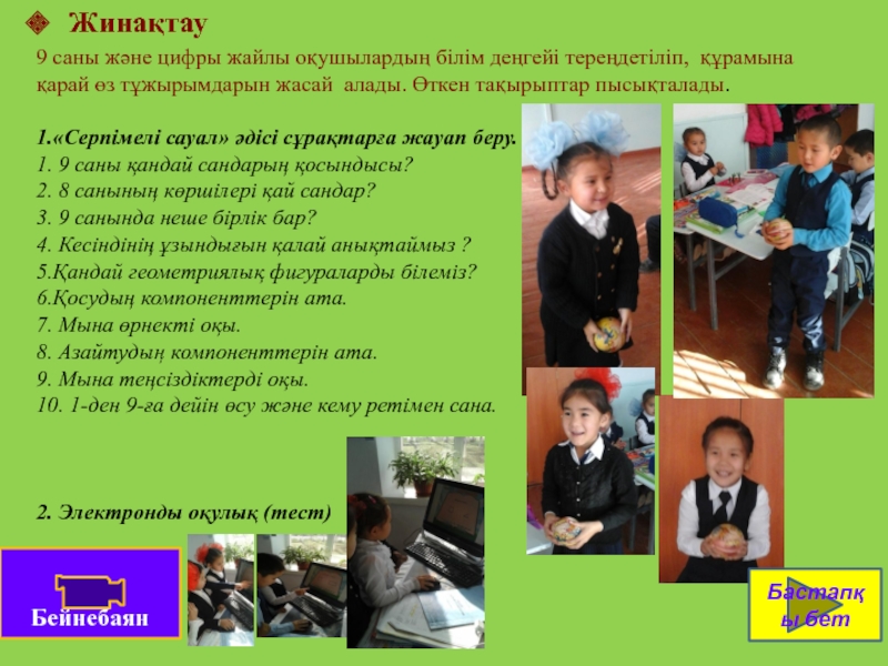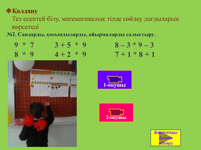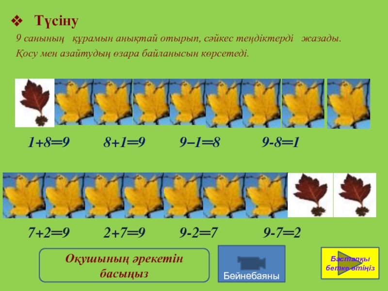 9 санының құрамы туралы оқушылардың білімін анықтай отырып, сәйкес теңдіктерді жазуға және оқуға оқушыларды қалыптастыру.