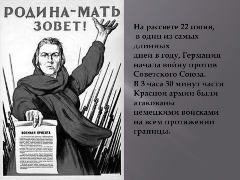 На рассвете 22 июня, в один из самых длинныхдней в году, Германия начала войну против Советского Союза. В 3 часа 30 минут части Красной армии были атакованы немецкими войсками на всем протяжении границы.