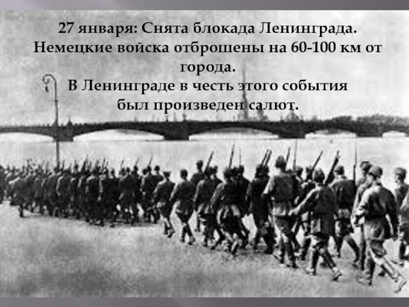 27 января: Снята блокада Ленинграда. Немецкие войска отброшены на 60-100 км от города. В Ленинграде в честь этого