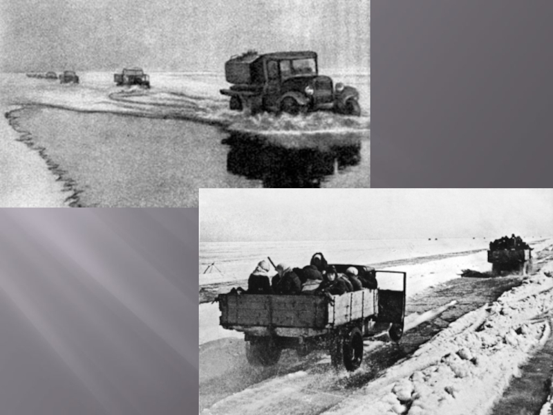 Для доставки в Ленинград продовольствия и для эвакуации ленинградцев была организована дорога по льду на Ладожском озере.