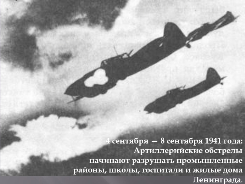 4 сентября — 8 сентября 1941 года: Артиллерийские обстрелыначинают разрушать промышленные районы, школы, госпитали и жилые дома Ленинграда.