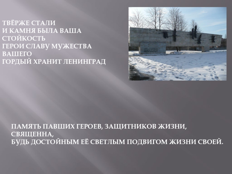 ТВЁРЖЕ СТАЛИ И КАМНЯ БЫЛА ВАША СТОЙКОСТЬ ГЕРОИ СЛАВУ МУЖЕСТВА ВАШЕГО ГОРДЫЙ ХРАНИТ ЛЕНИНГРАДПАМЯТЬ ПАВШИХ ГЕРОЕВ, ЗАЩИТНИКОВ