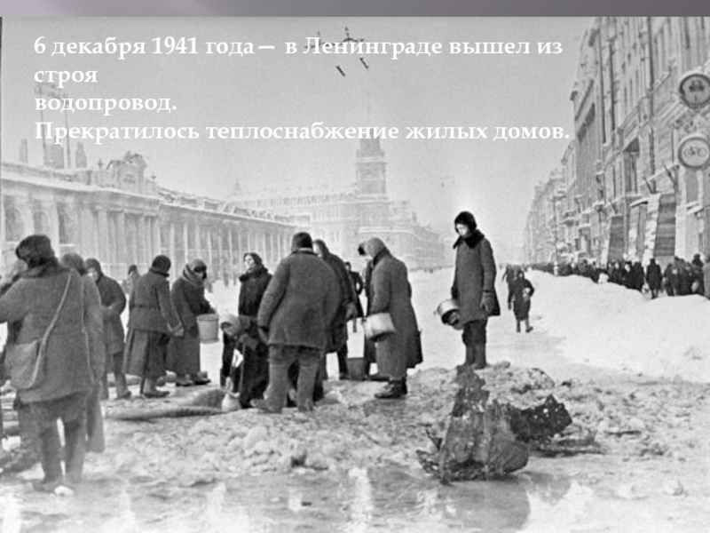 6 декабря 1941 года— в Ленинграде вышел из строя водопровод. Прекратилось теплоснабжение жилых домов.