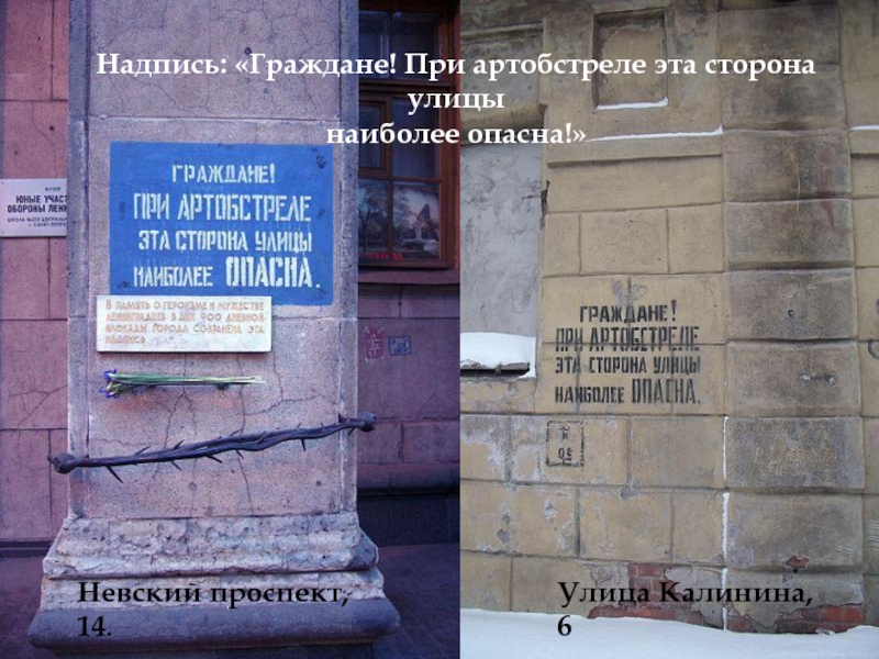 Надпись: «Граждане! При артобстреле эта сторона улицы наиболее опасна!»Невский проспект, 14.Улица Калинина, 6