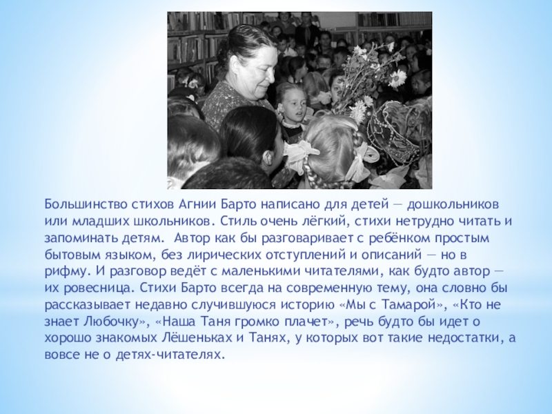 Большинство стихов Агнии Барто написано для детей — дошкольников или младших