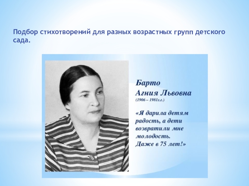 Слайд 3Подбор стихотворений для разных возрастных групп детского сада.