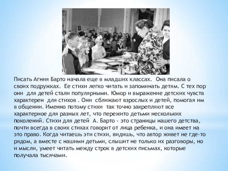Слайд 13Писать Агния Барто начала еще в младших классах. Она писала о