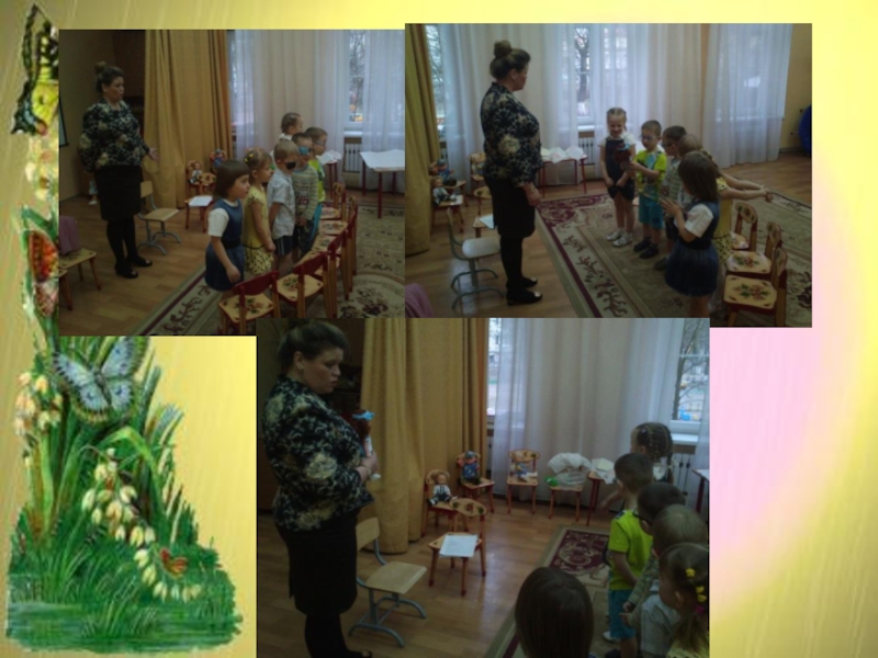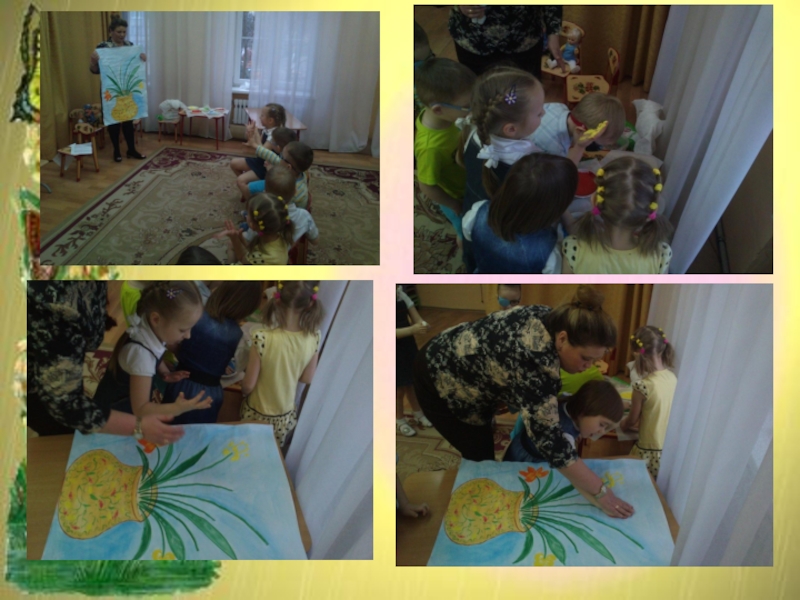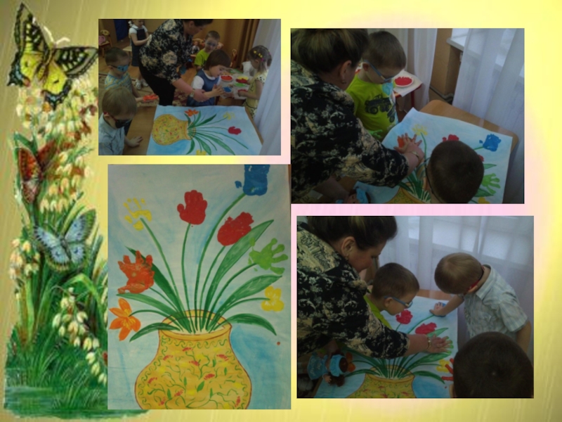 Описание работы: по рисованию пальчиковой краской- отпечатывание ладошек левой и правой рук, на заранее подготовленной композиции букета в вазе без цветов. Дети окунают ладошки в заранее подготовленные тарелочки с пальчиковой краской и делают отпечатки ладошек на композиции, тем самым, создавая цветы(тюльпаны). После выполнения работы, дети вытирают руки влажными салфетками. Во время работы детей воспитатель поворачивает кукол друг к другу.