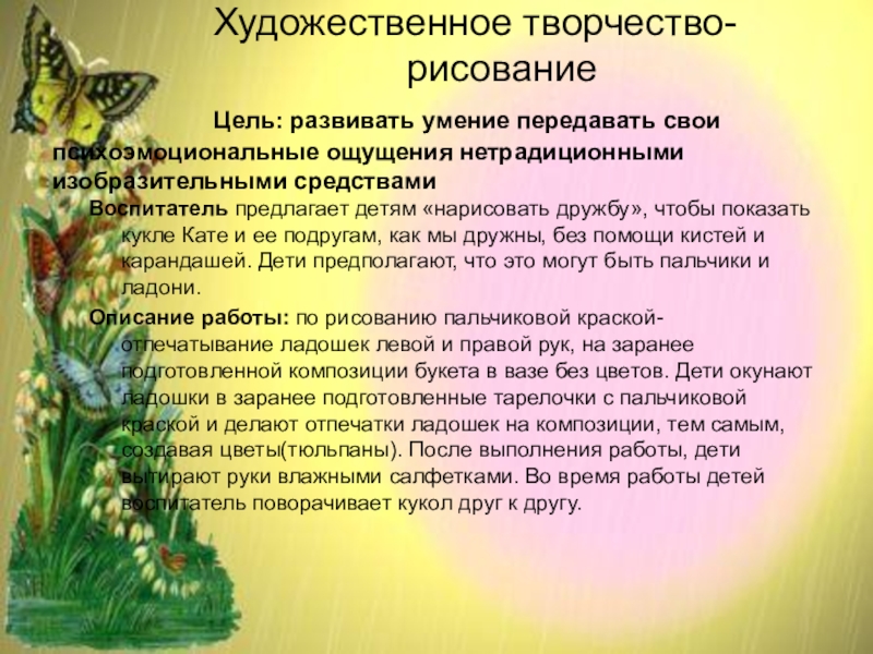 Воспитатель предлагает детям «нарисовать дружбу», чтобы показать кукле Кате и ее подругам, как мы дружны, без помощи кистей и карандашей. Дети предполагают, что это могут быть пальчики и ладони.