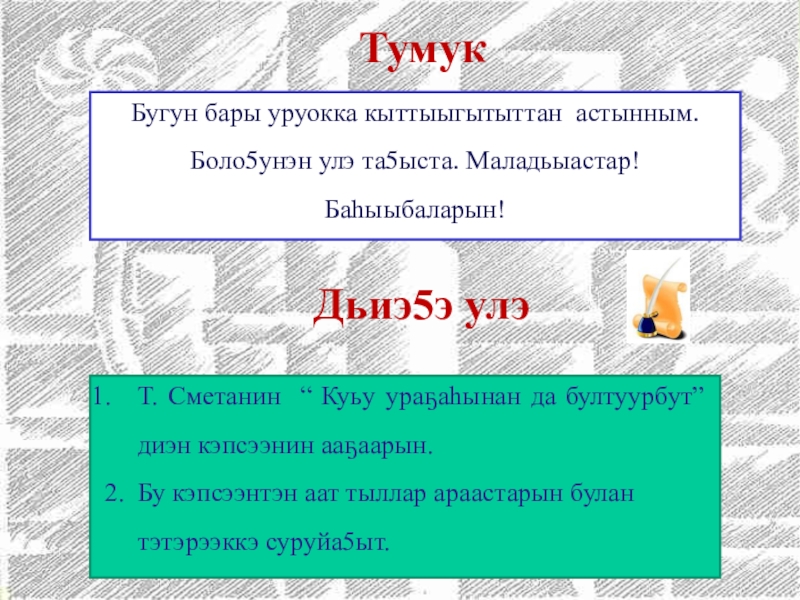 Т. Сметанин “ Куьу ураҕаһынан да бултуурбут” диэн кэпсээнин ааҕаарын.