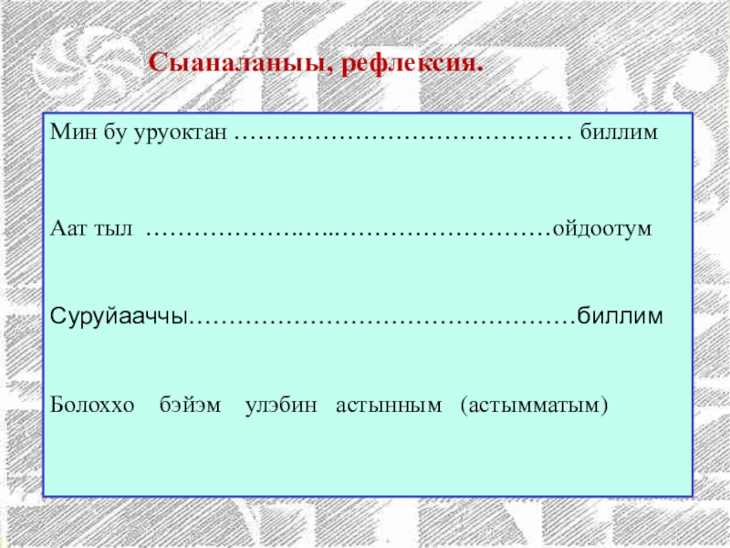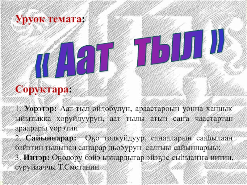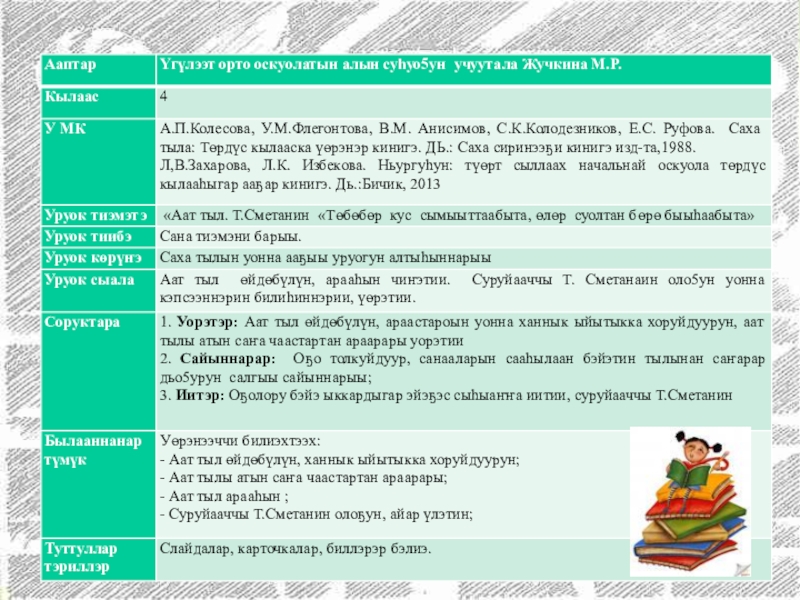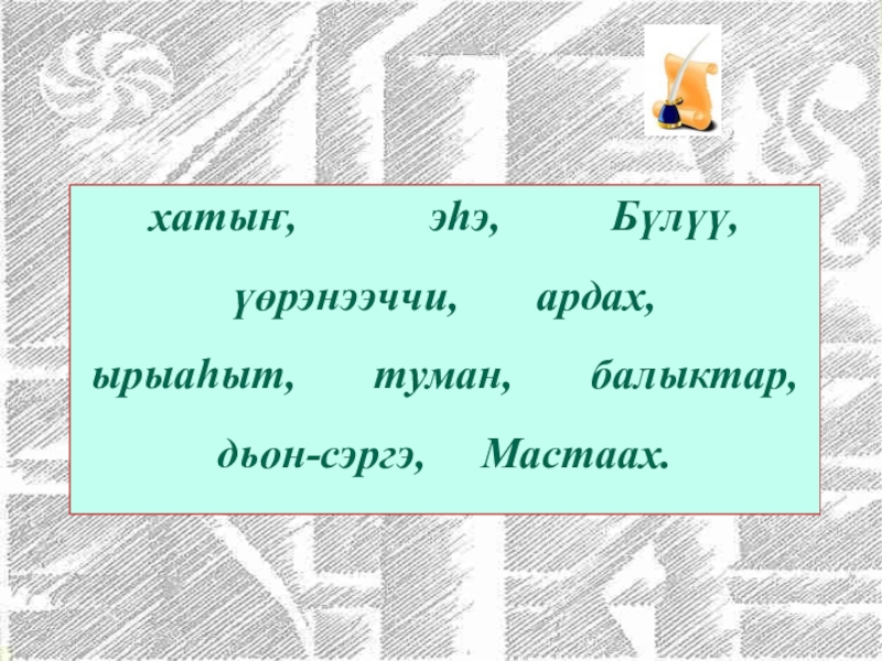 Кырса, сылгыһыт, кинигэлэр, боһүөлэк, балыксыт, хаалтыс, муҥхаhыт, балык, булчут.