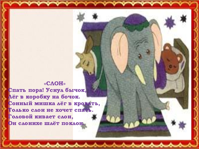 «СЛОН»Спать пора! Уснул бычок,Лёг в коробку на бочок.Сонный мишка лёг в кровать,Только слон не хочет спать.Головой кивает