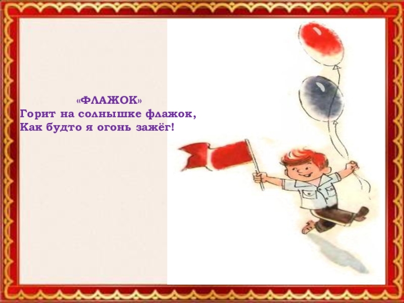 «ФЛАЖОК»Горит на солнышке флажок,Как будто я огонь зажёг!